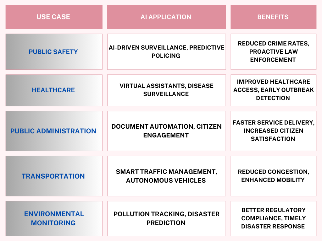 Artificial intelligence in government sector has the potential to transform almost every aspect of governance. Here are some of the most impactful use cases: