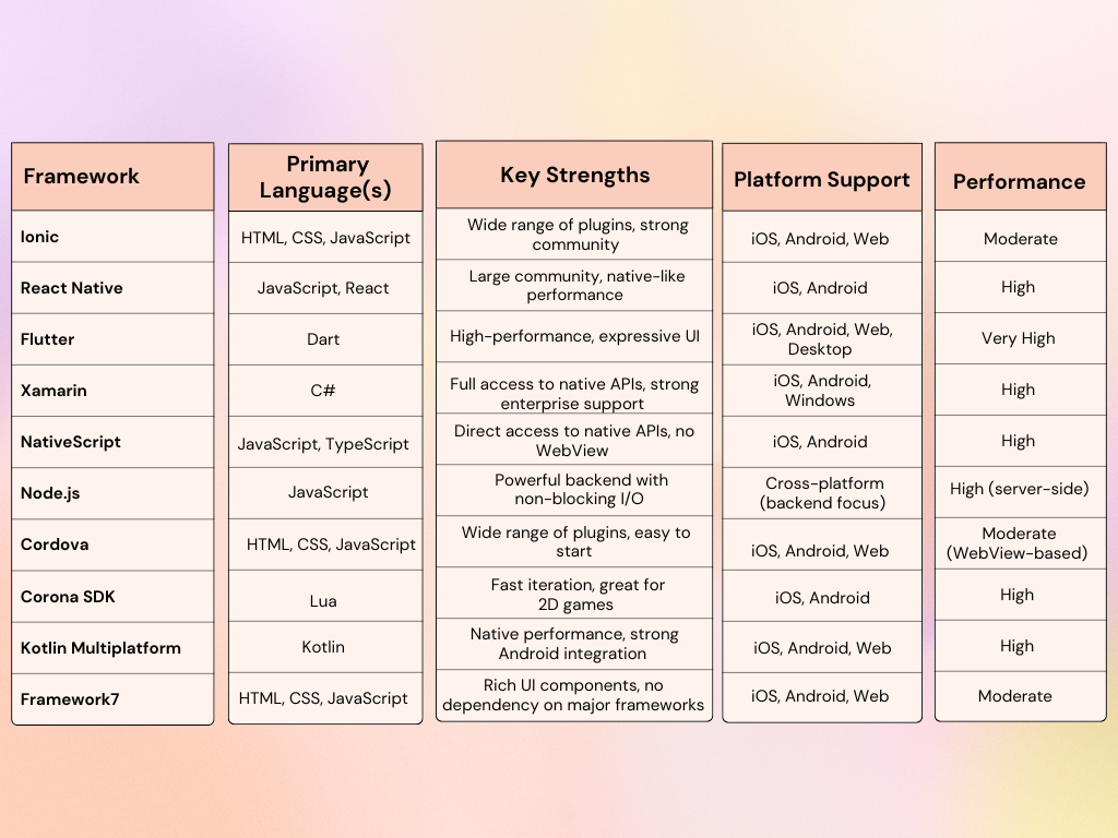 Let’s quickly summarize how these cross-platform app development frameworks compare against each other.